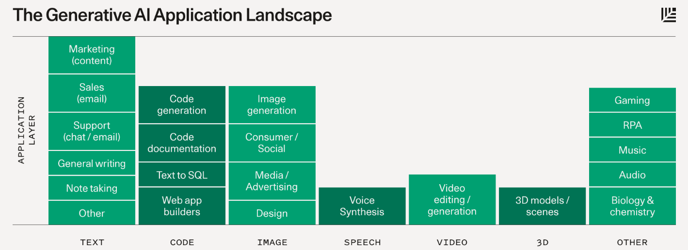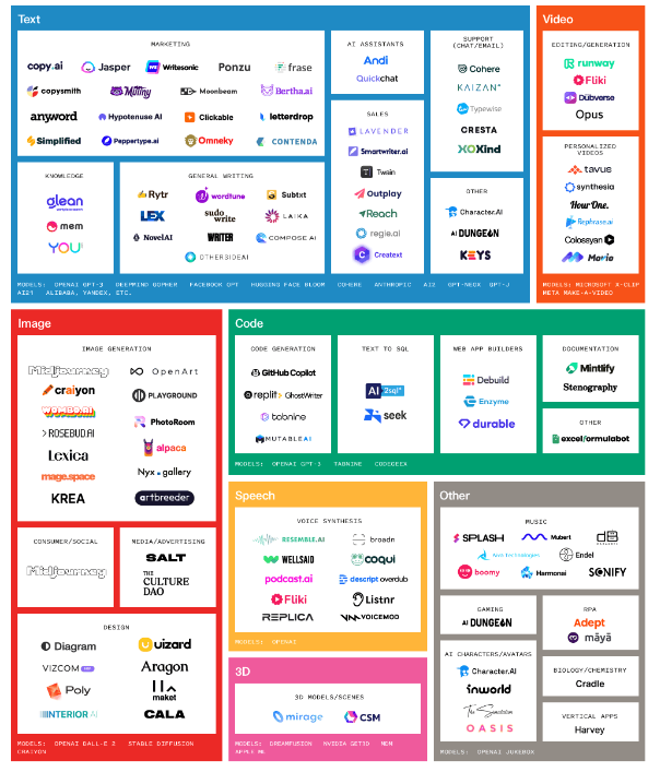 - The Generative AI Application Landscape - An infographic that maps the generative AI ecosystem, by Sonya Huang of Sequioa Capital.